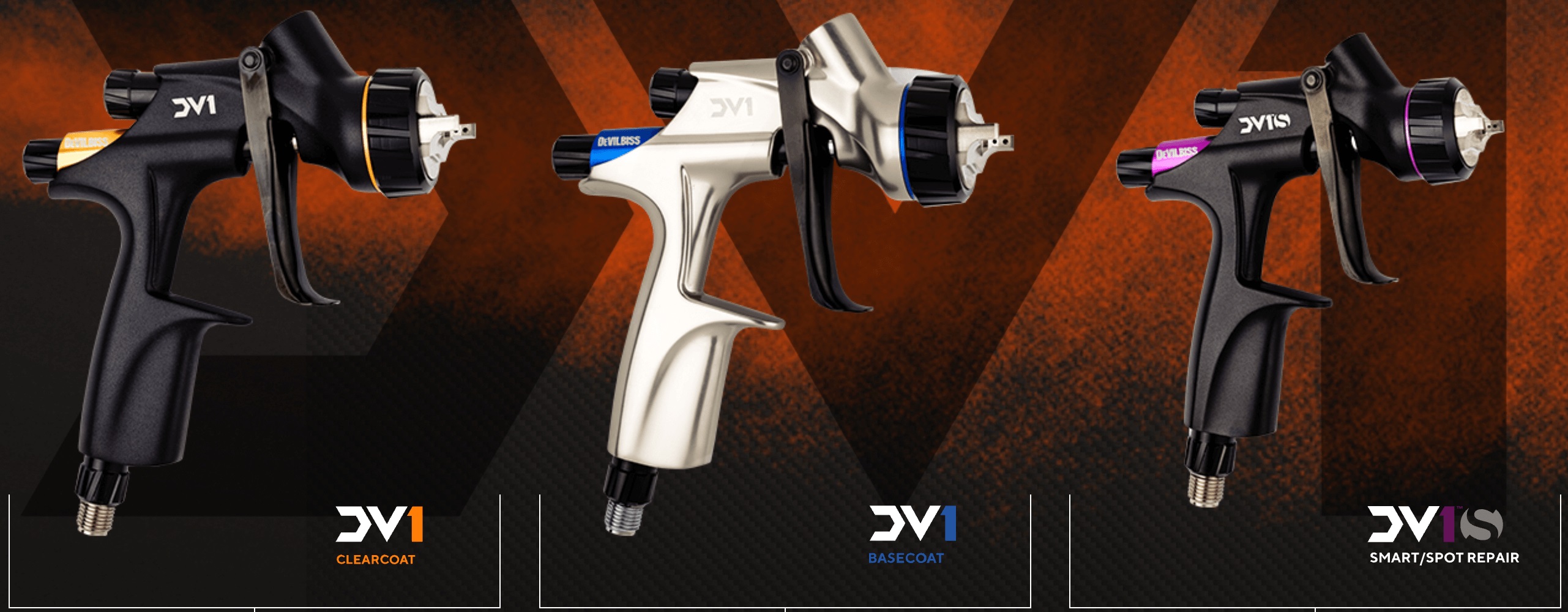 Model Devilbiss DV1 dostępny jest z trzema rozmiarami dysz: 1,1; 1,2 i 1,3 oraz dwiema głowicami rozpyłowymi HVLP i HVLP+ (naszym zdaniem skrót HVLP jest w tym przypadku niefortunny bo jest to nowsza technologia aplikacji niż jej geneza). Przeznaczona jest do aplikacji lakierów bezbarwnych a przede wszystkim lakierów bazowych. Doskonale sprawdzi się w aplikacji baz wodnych i konwencjonalnych.