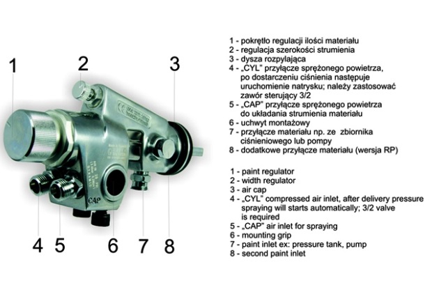 natrysku ("CYL") oraz na regulowanie strumienia materiału ("CAP"). Urządzenie
