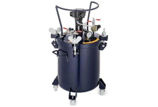 Profesjonalny zbiornik ciśnieniowy, wyposażony w kółka oraz mieszadło pneumatyczne. Pojemność wewnętrzna