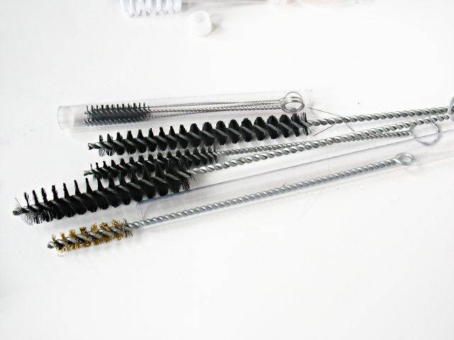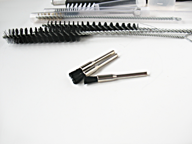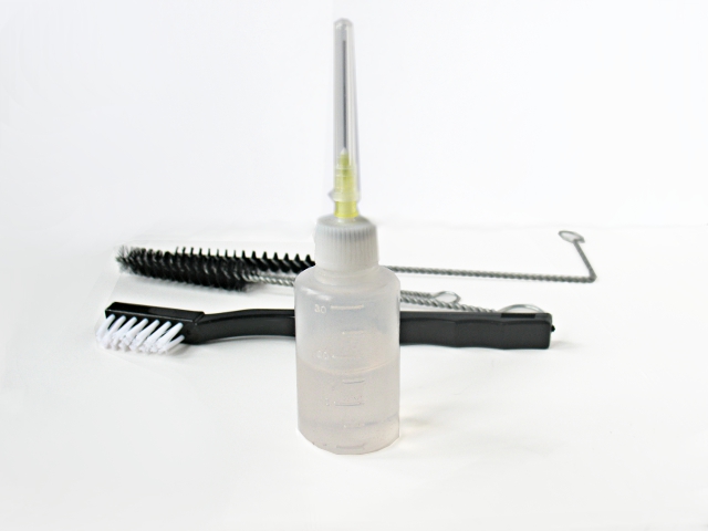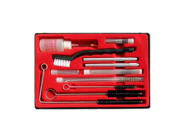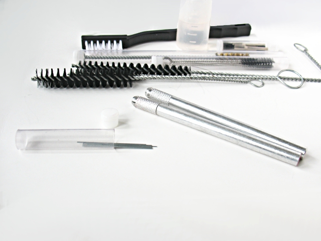 W zestawie znajdują się igły, wyciory, szczotka miedziana, pędzelki i buteleczka z zakraplaczem igłowym (bez oleju) do konserwacji
