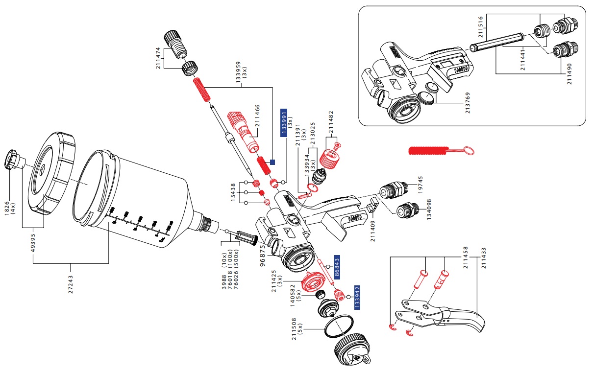 Zestaw naprawczy do pistoletu SATA X5000 indeks 211532pozycje oznaczone kolorem czerwonym na schematcie.